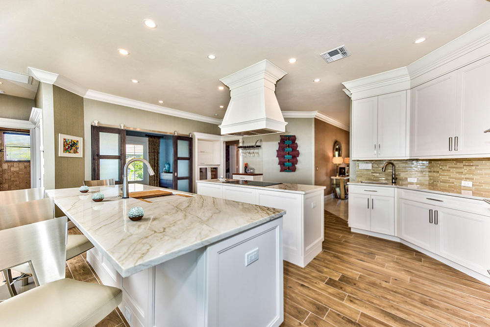 The expertise of Sonrise Building with the expert professional eye of interior designer Natash Pereira was utilized to bring elegance and new life into the house. Along with an expansive outdoor kitchen and entertainment area, the indoor kitchen was transformed into a gorgeously modern room.