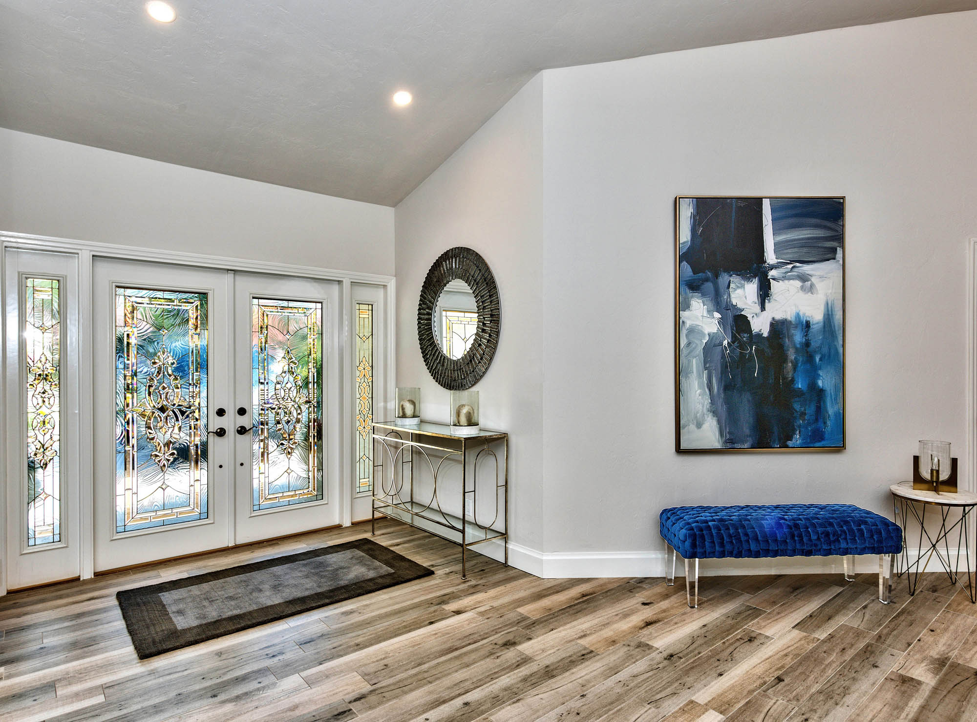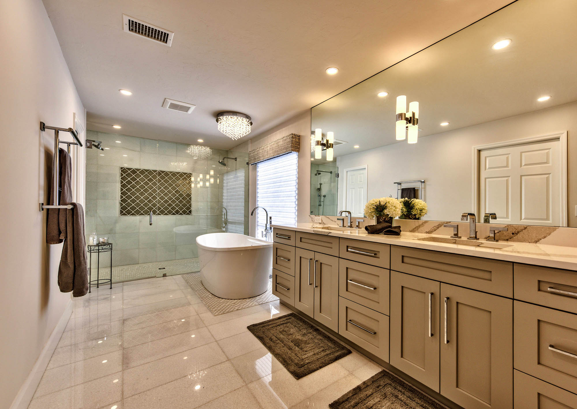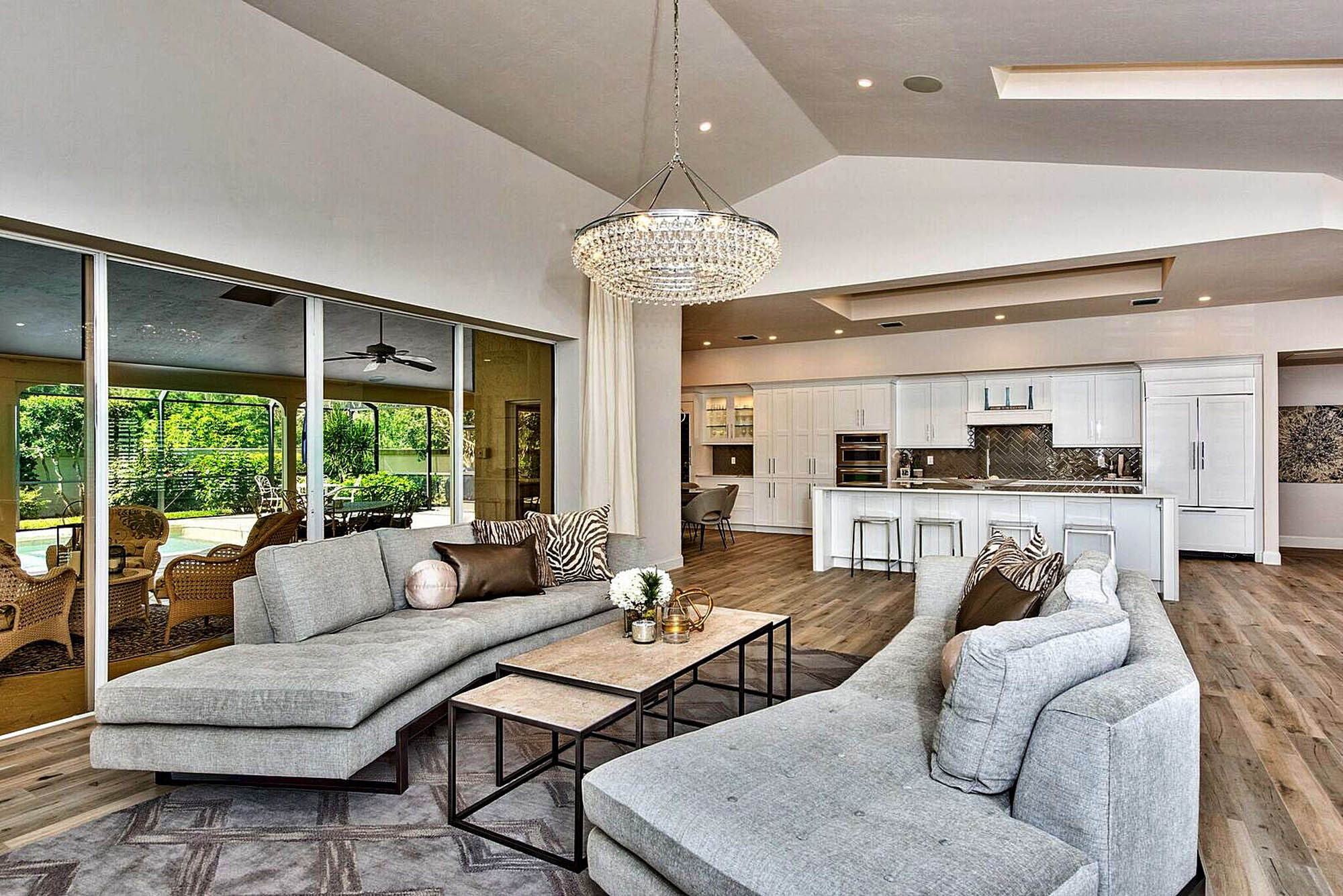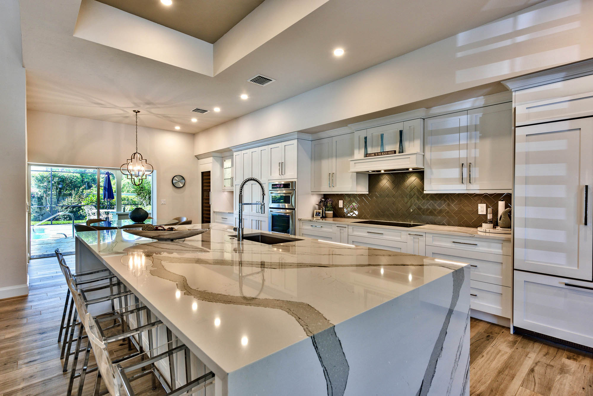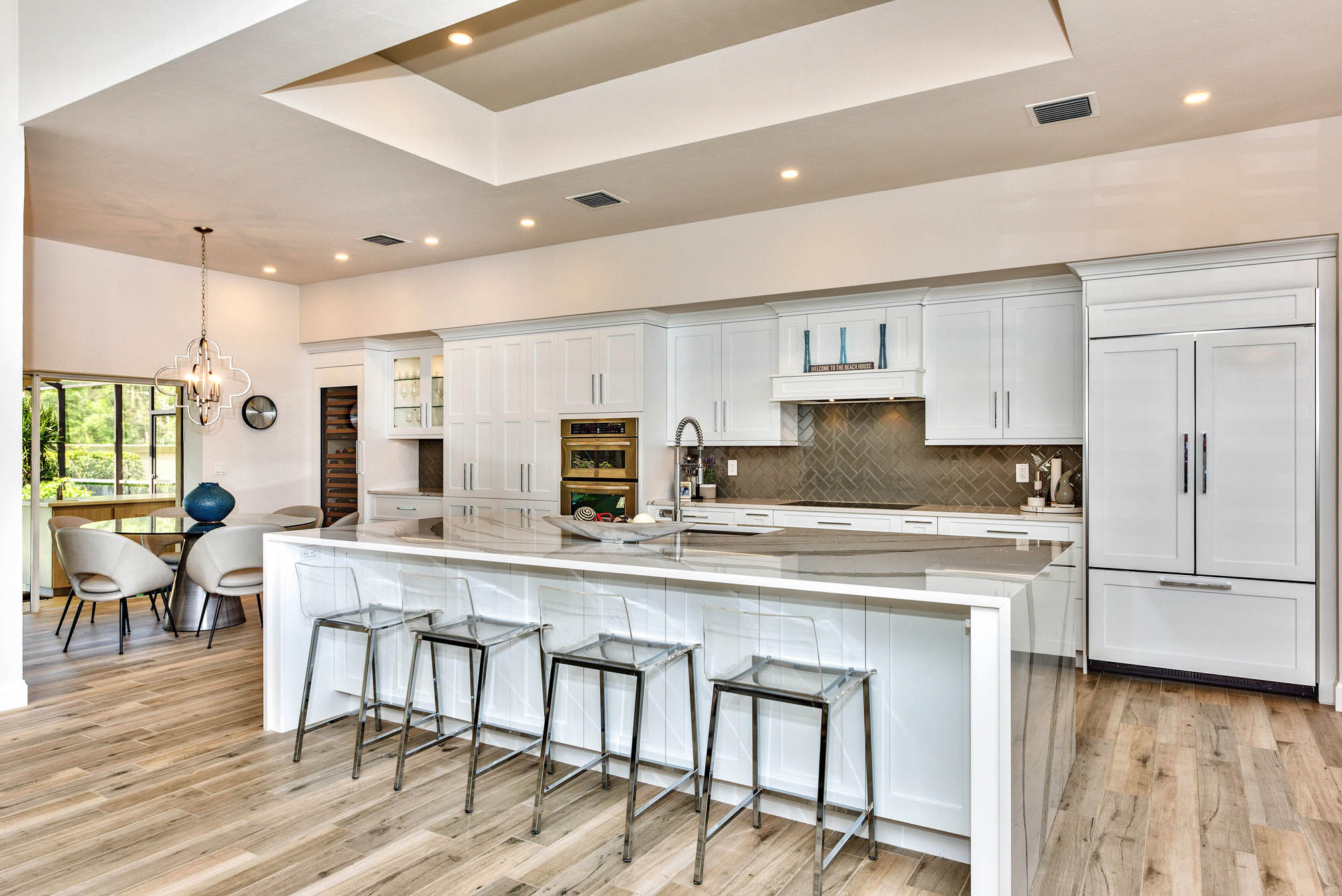 In this extensive Naples renovation, careful design considerations where made, especially in the kitchen and bath areas, in order to meet the desired concepts the owners had in mind. Demolition involved the removal of walls, flooring, cabinets and vanities, plumbing and electricals in much of the home. The kitchen, dining room, living room and foyer, master bedroom and bath, guest bedroom, study, powder room, hallways, and laundry were all involved. Wood look, wide-plank tile flooring was installed throughout the home along with high base moldings, new doors, LED can lighting, and updated lighting fixtures.