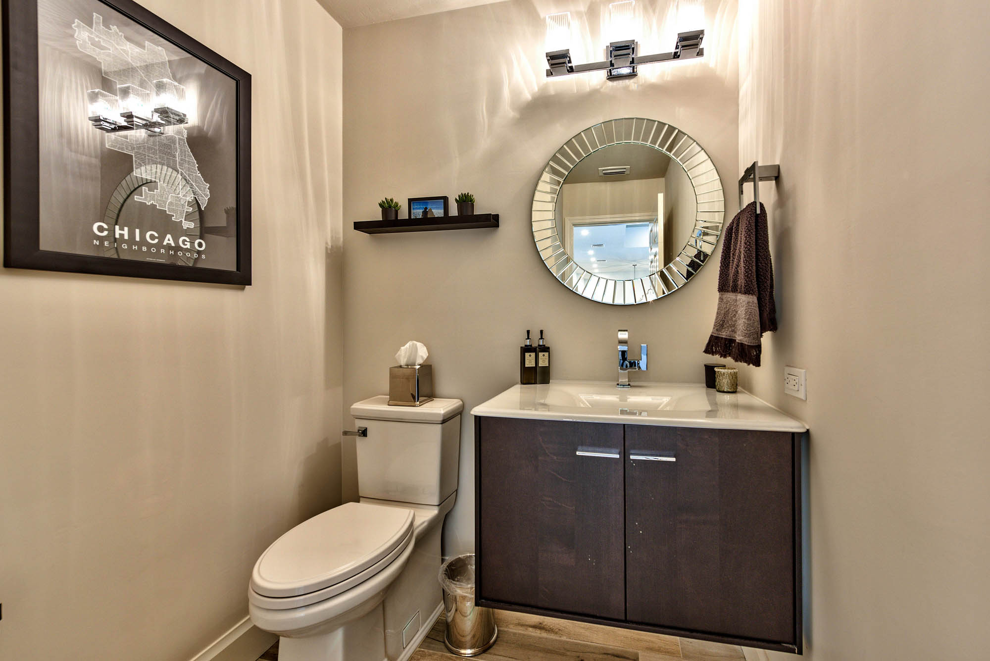 The kitchen, dining, and living room area renovation is especially noteworthy. Walls were removed so those individual rooms could be combined to create a single, modern open space. In the kitchen area, custom wood cabinets and a spacious custom designed island was added along with seamless Cambria natural stone countertops, tile backsplash, plumbing fixtures, and paneled top-end appliances including a wine cooler.