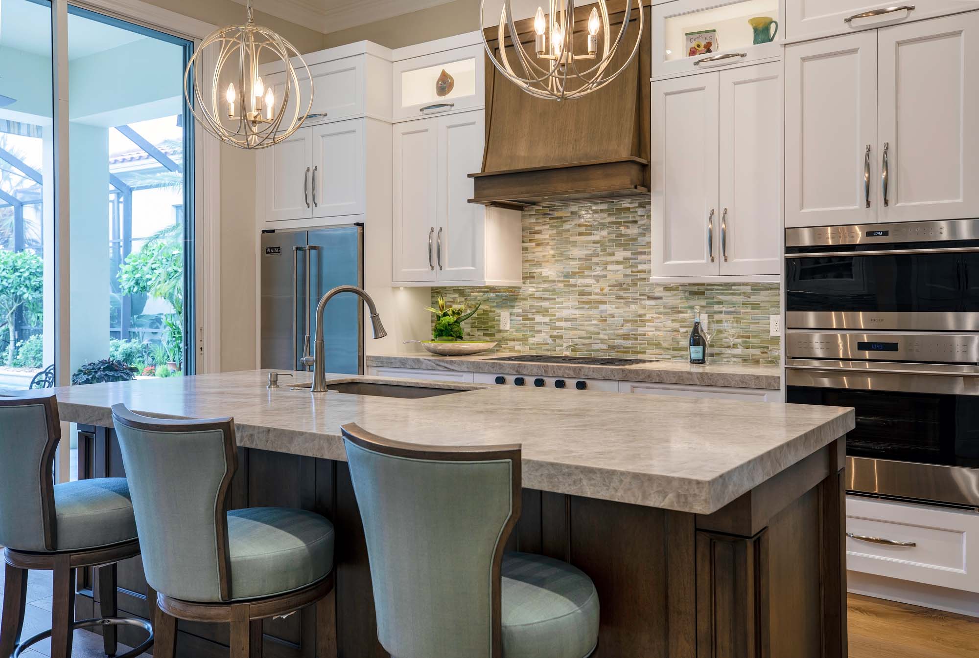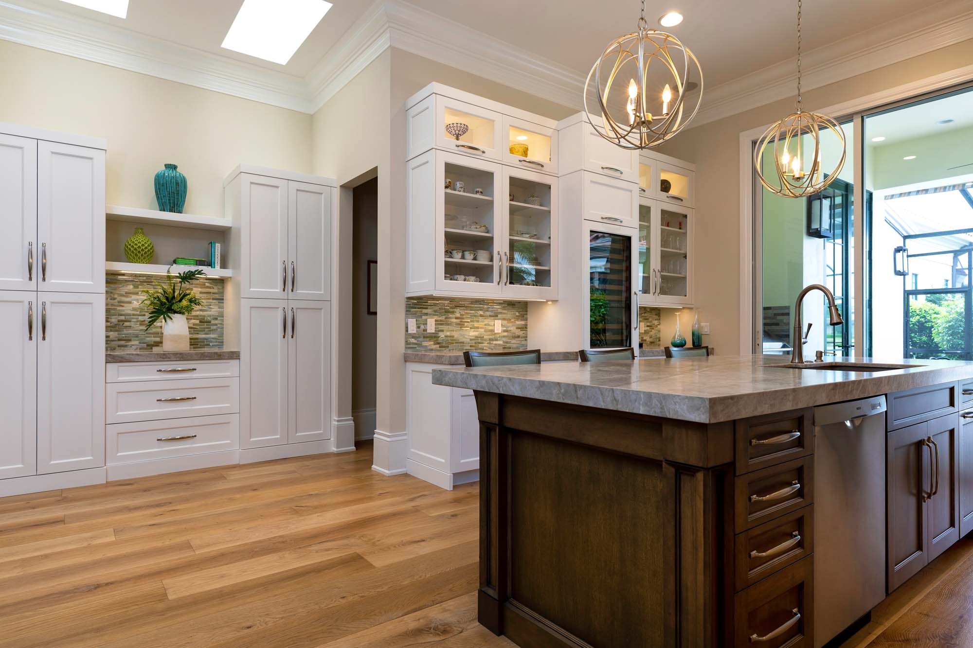 This remodeling project for new owners of this Grey Oaks home involved extensive structural work required to relocate and create a new kitchen, extending the master suite, and adding a covered outdoor kitchen. Other changes included new wood and tile flooring throughout, added architectural trim and columns, new plumbing and lighting fixtures, exterior stucco and trim work, and the replacement of deck pavers with travertine.