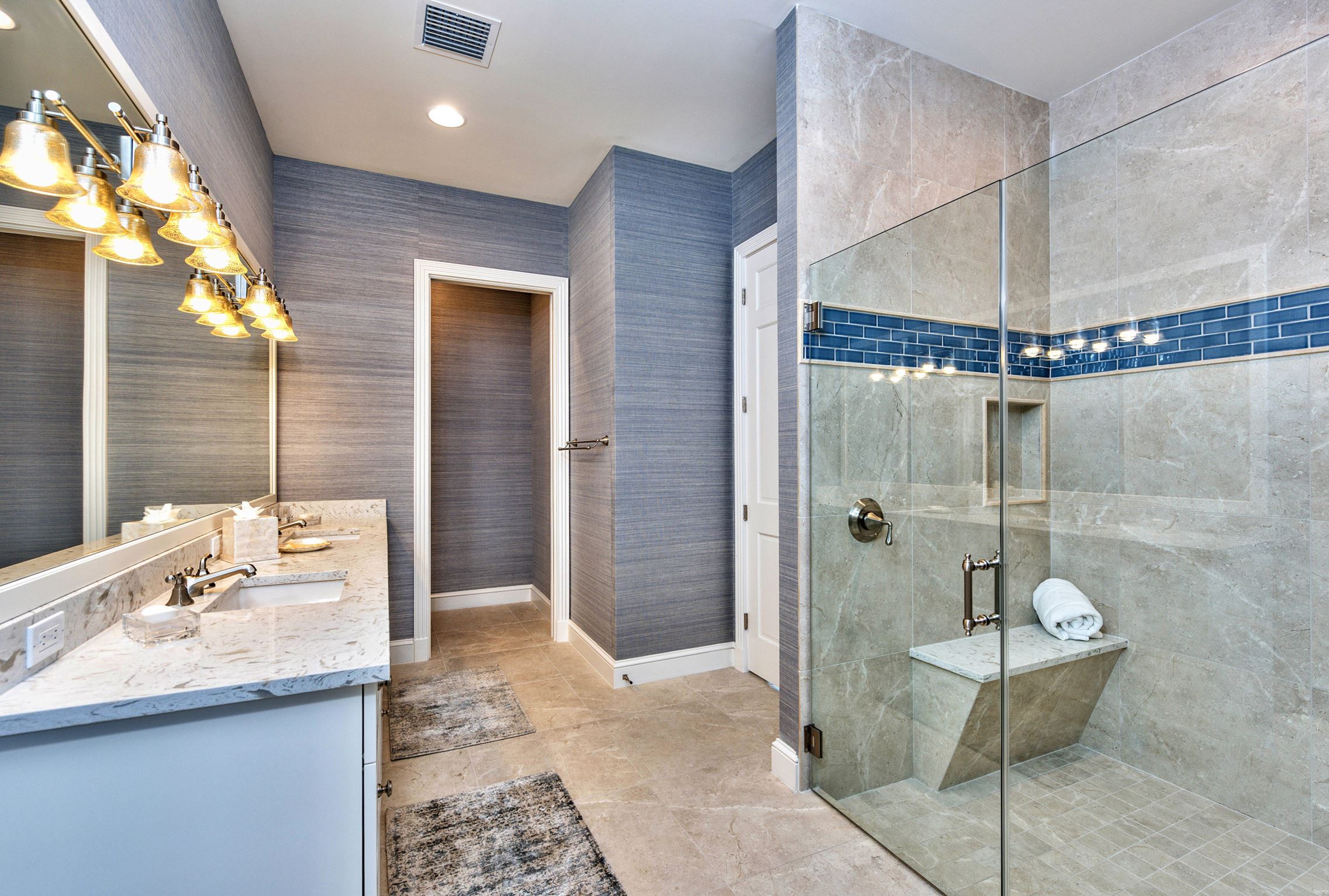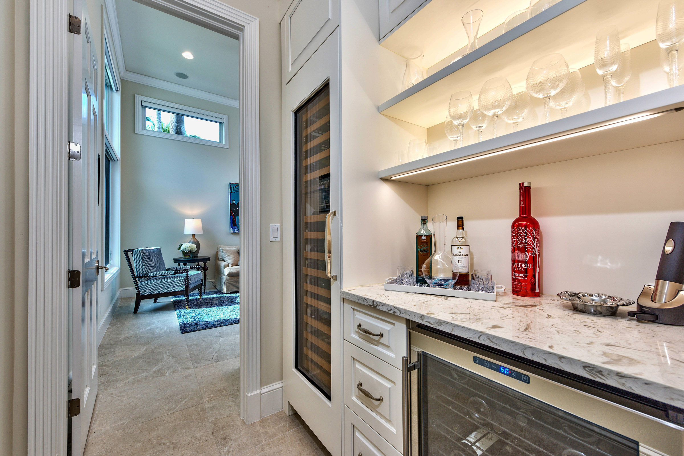 The bath extends off the bedroom that includes a double vanity and a beautifully tiled oversized shower. And the wine room includes ample wine storage and a wine cooler all built in to custom designed cabinets.