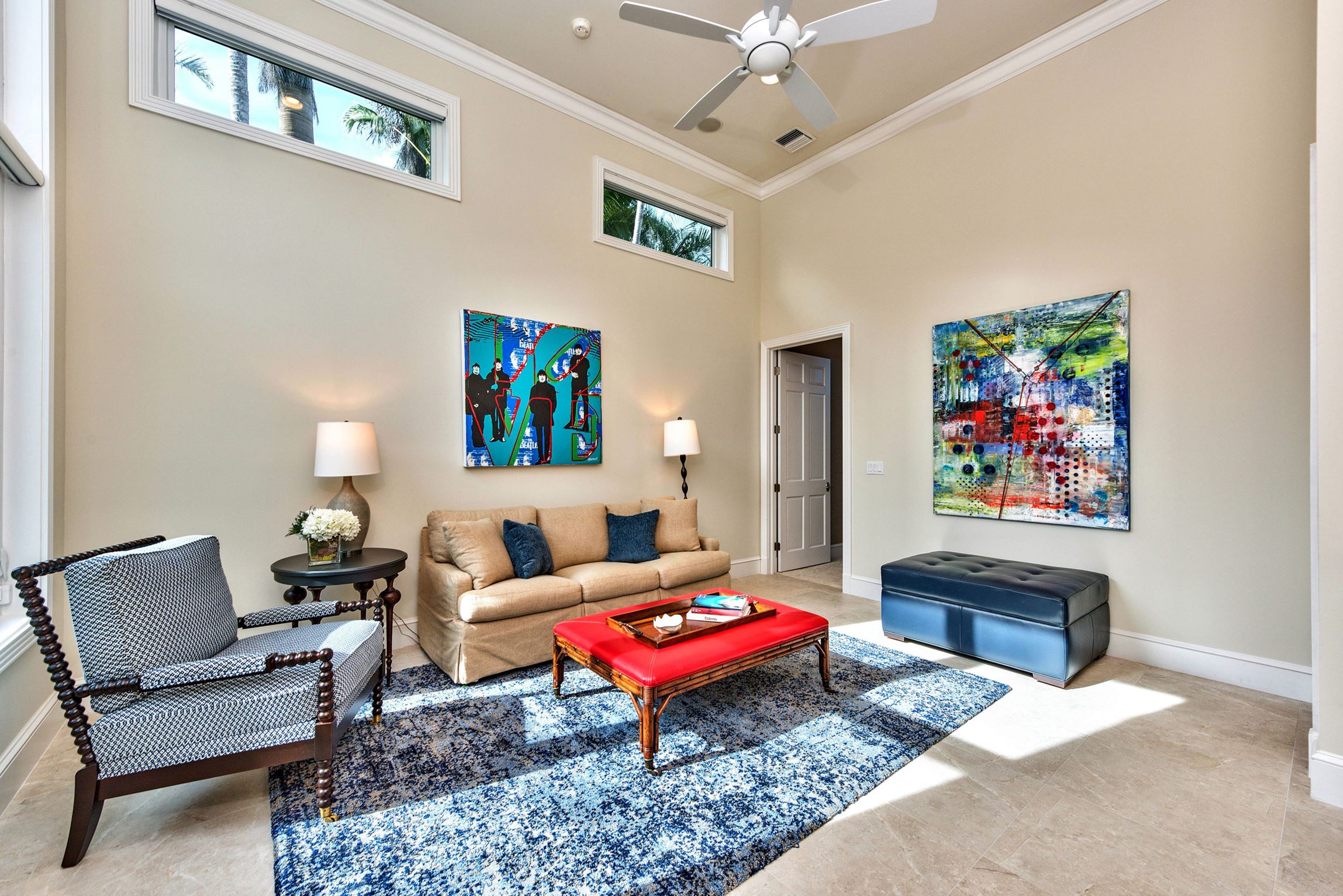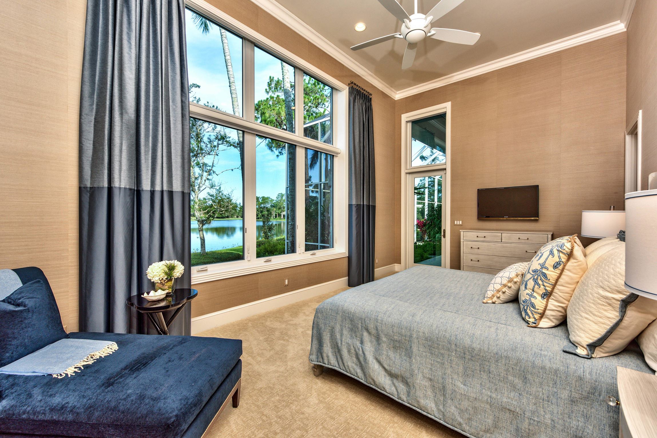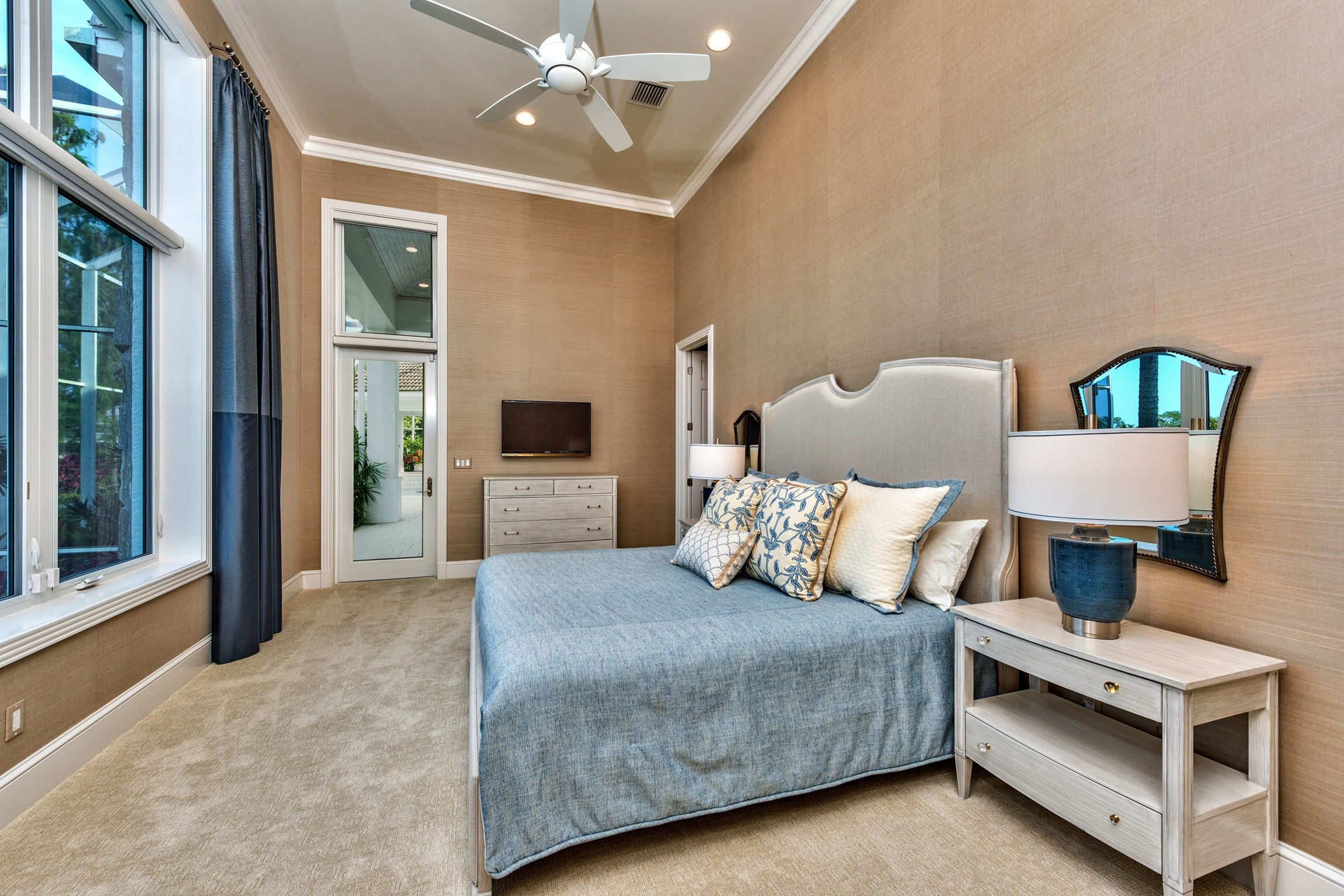 The guest suite addition features impressive 20’ ceilings in the living room and bedroom with 10’ ceilings in the remaining spaces. Expansive windows, sized proportionately with the high ceilings, were incorporated into the design of the bedroom and continued into the living room. A doorway leading from the bedroom to the outdoor pool deck was also incorporated.