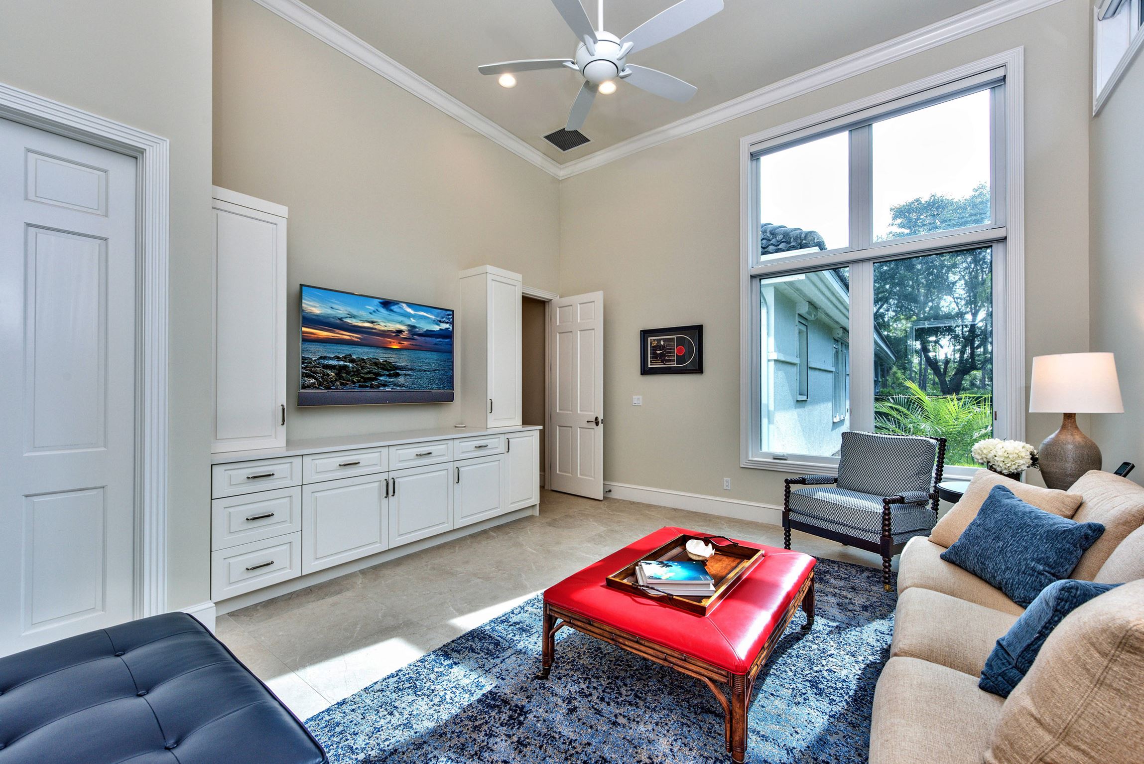 The media wall in the living room features custom, solid wood cabinets providing ample storage for electronics and miscellaneous items.