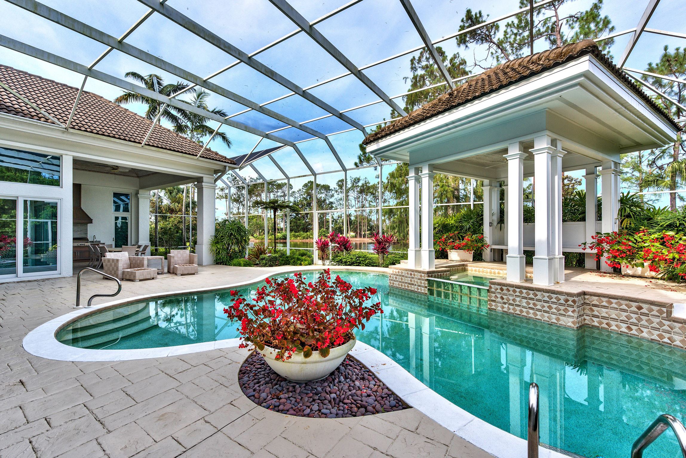 One of Sonrise Building’s more recent projects in Grey Oaks involved the addition of a 1,000 square foot guest suite complete with a living room with media wall, a spacious bedroom and bathroom, and a wine room. A custom outdoor kitchen was also added to the home’s pool area.