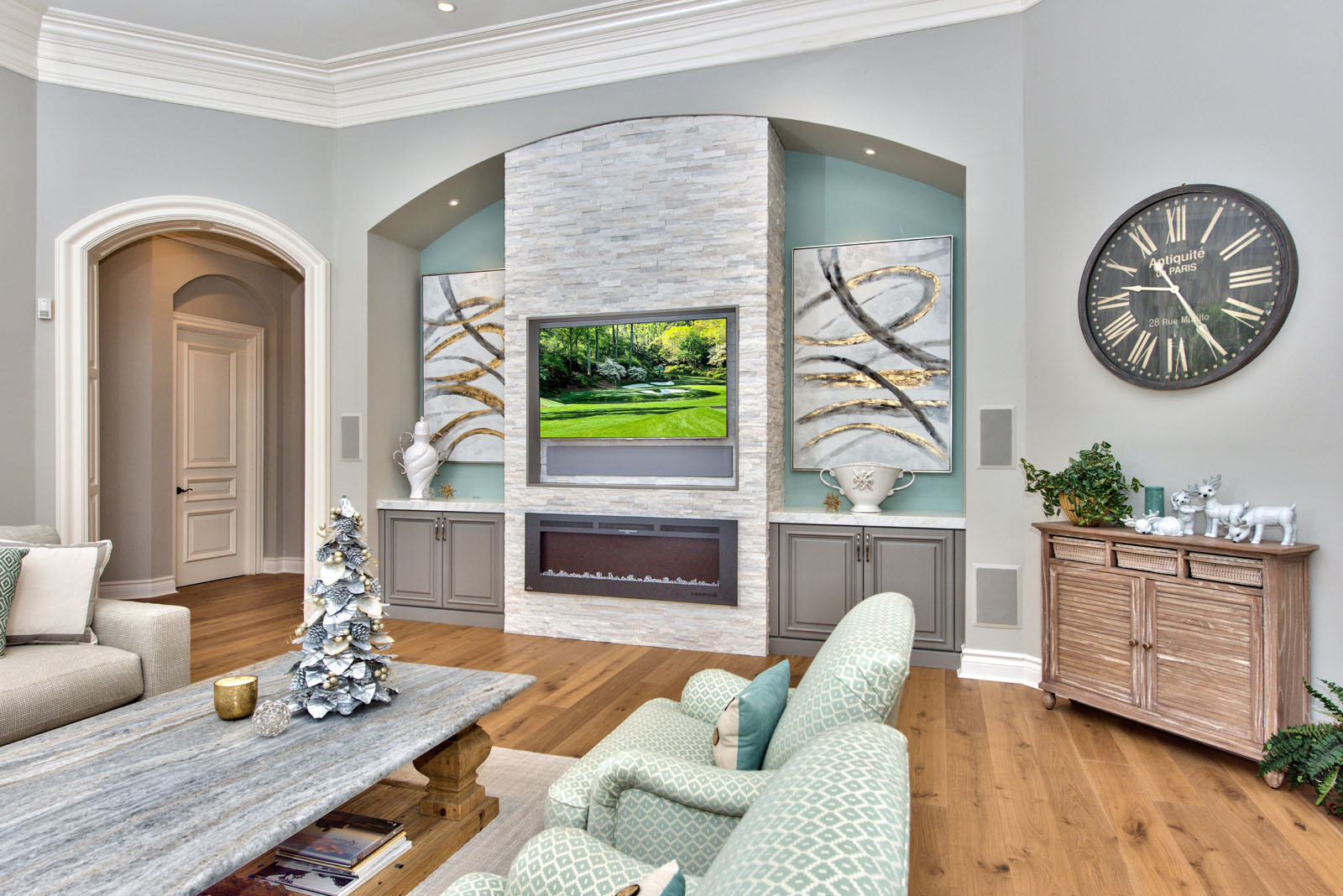 In the adjoining great room, a wall of cabinets was removed, and a clean “media” wall was created which featured the installation of an electric fireplace. Rewiring to accommodate new AV was also performed and lighting was changed over to LED fixtures and controls throughout.